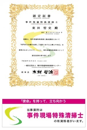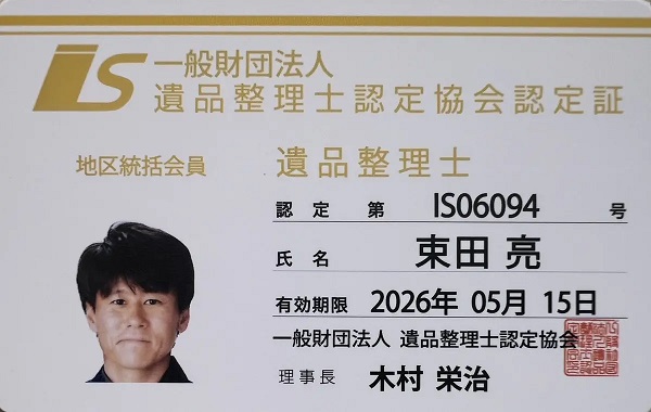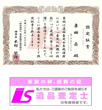 この優良事業所認定というのは、「遺品整理士」資格の認定を受け、“ 遺品整理業界の健全化 ”に取り組み、 適正業務を行っている“優良企業” を意味します。法規制を守り、遺品整理業務を真摯に行っている企業となっておりますので、ご依頼されるご遺族様におかれましては、安心してご依頼頂ける証となっております。