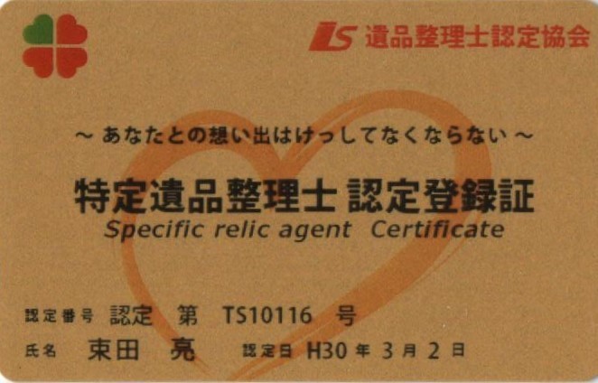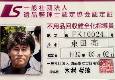 特定遺品整理士は、遺品整理士認定協会の「遺品整理士」に加え、より専門性の高い「不用品回収健全化指導員」の資格を持つプロフェッショナルです。悪質な不用品回収業者や法違反から地域住民を守り、安全かつ法令を遵守した適正な整理・処分を行うことをミッションとしています。当社は当然2つを所持しておりますので、特定遺品整理士であります。